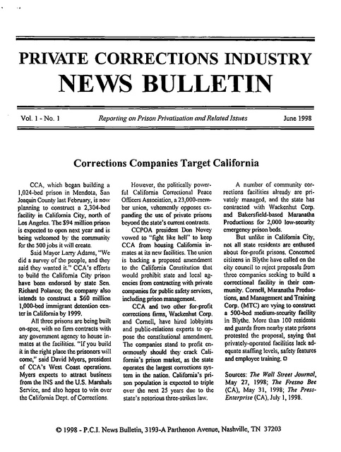 PRIVATE CORRECTIONS INDUSTRY NEWS BULLETIN Vol. 1 - No.1 Reporting on Prison Privatization and Related Issues June 1998 Corrections Companies Target California CCA, which began building a l,024-bed prison in Mendota, San Joaquin County last February, is now planning to construct a 2,304-bed facility in California City, north of Los Angeles. The $94 million prison is expected to open next year and is being welcomed by the community for the 500 jobs it "ill create. Said Mayor Lany Adams, "We did a survey of the people, and they said they wanted it." CCA' s efforts to build the California City prison have been endorsed by state Sen. Richard Polanco; the company also intends to construct a $60 million 1,000-bed immigrant detention center in California by 1999. All three prisons are being built on-spec, with no firm contracts with any government agency to house inmates at the facilities. "If you build it in the right place the prisoners will come,'· said David Myers, president of CCA's West Coast operations. Myers expects to attract business from the INS and the U.S. Marshals Service, and also hopes to \\in over the California Dept. of Corrections. However, the politically powerful California Correctional Peace Officers Association, a 23,000-member union, vehemently opposes expanding the use of private prisons beyond thc state's current contracts. CCPOA president Don Novey vowed to "fight like hell" to keep CCA from housing California inmates at its new facilities. The union is backing a proposed amendment to the California Constitution that would prohibit state and local agencies from contracting with private companies for public safety services, including prison management. CCA and two other for-profit corrections firms, Wackenhut Corp. and Cornell, have hired lobbyists and public-relations experts to oppose the constitutional amendment. The companies stand to profit enormously should they crack California's prison market, as the state operates the largest corrections system in the nation. California's prison popUlation is expected to triple over the next 25 years due to the state's notorious three-strikes law. A nwnber of community corrections facilities already are privately managed, and the state has contracted with Wackenhut Corp. and Bakersfield-based Maranatha Productions for 2,000 low-security emergency prison beds. But unlike in California City, not all state residents are enthused about for-profit prisons. Concerned citizens in Blythe have called on the city council to reject proposals from three companies seeking to build a correctional facility in their community. Cornell, Maranatha Productions, and Management and Training Corp. (MTC) are vying to construct a SOO-bed medium-security faeility in Blythe. More than 100 residents and guards from nearby state prisons protested the proposal, saying that privately-operated facilities lack adequate staffing levels, safety features and employee training. 0 Sources: The Wall Street Journal, May 27, 1998; The Fresno Bee (CA). May 31, 1998; The PressEnterprise (CA), July 1, 1998. <01998 - p.e.!. News Bulletin, 3193-A Parthenon Avenue, Nashville, TN 37203 P.C.I. News Bulletin 2 AFSCME Report Critical of Prison Privatization On May 6, 1998, Corrections United, a 100,000-member subdivision of the American Federation of State, County and Municipal Employees, released a scathing report on the private prison industry. "Private prisons are a threat to public safety, a taxpayer ripoff and they saddle the public with unlimited liability," stated AFSCME President Gerald McEntee. Last year McEntee withdrew his union's support from a prison privatization bill being considered by the Tennessee legislature. The 16-pagc report cited myriad problems at private prisons, including the following: ~ A guard at a privately-operated facility in Florida who aided an inmate's escape. ~ Video-taped brutality and abuse at a CCRI-managed jail in Brazoria County, Texas. ~ The license revocation of a privately-run juvenile prison in Brush, Colorado. ~ Florida paid a private company $48-$49 a day per inmate, when it cost the state $43 per day for each prisoner housed at public jails. ~ A study by Ok1ahoma officials indicated that the state paid 45% more to house prisoners at private prisons than in its o\\n facilities. The AFSCME report also noted that guards at privately-run prisons are paid less and receive fewer benefits than their public counterparts. A spokesperson for CCA discounted the union report as "assertions and allegations based on nothing." Several prison guards' unions took action to highlight the report locally. AFSCME Council 4, which represents almost 5,000 corrections employees in Connecticut, gathered at the state capitol to denounce prison privatization efforts. Connecticut Governor John G. Rowland is considering plans to transfer 350 inmates to rent-a-jails in other states at a cost of$7.2 million. "The governor has the authority to do it on his own, but we know it's a bad idea," said state Rep. Michael Lawler, who supports the union's opposition to privatization. "Justice is not something that can be put out to bid; public safety is not something that can be put out to bid," he added. Michael Minney, president of AFSCME Local 391, noted that the state still has the option of reopening the 350-bed Northeast Correctional Institution, which was closed in 1996 around the same time that Gov. Rowland began contemplating out-of-state inmate transfers. ''No one is claiming the DOC is perfect, but it is doing a much better job than the more costly companies operating prisons for profit," Minney said According to Council 4 executive director Michael Ferrucci, prison privatization was the topic of numerous press conferences held by Corrections United chapters across the country following the release of the AFSCME report. 0 Sources: San Francisco Chronicle, May 7, 1998; The Tennessean, May 7, 1998; The JOllrnallnquirer (CT), May 13, 1998. June 1998 In the Ne\